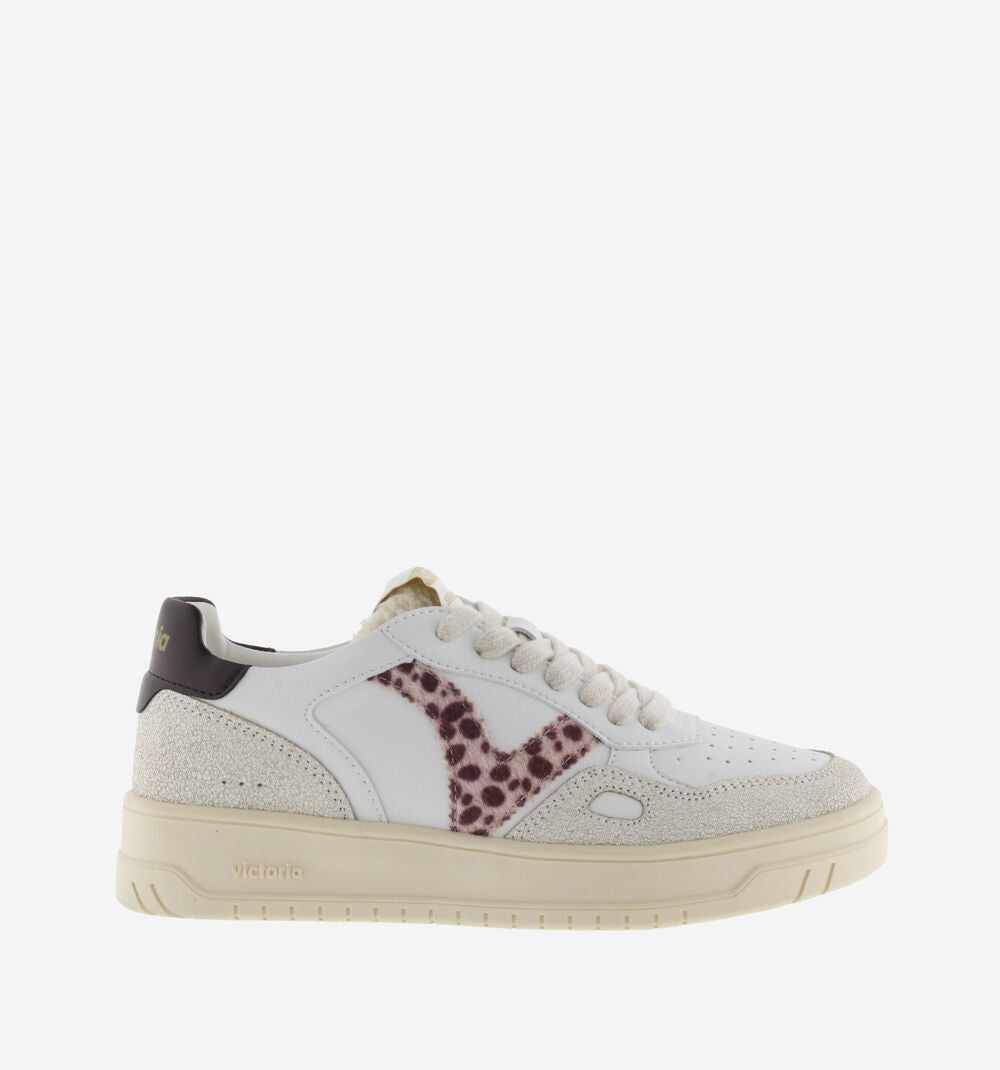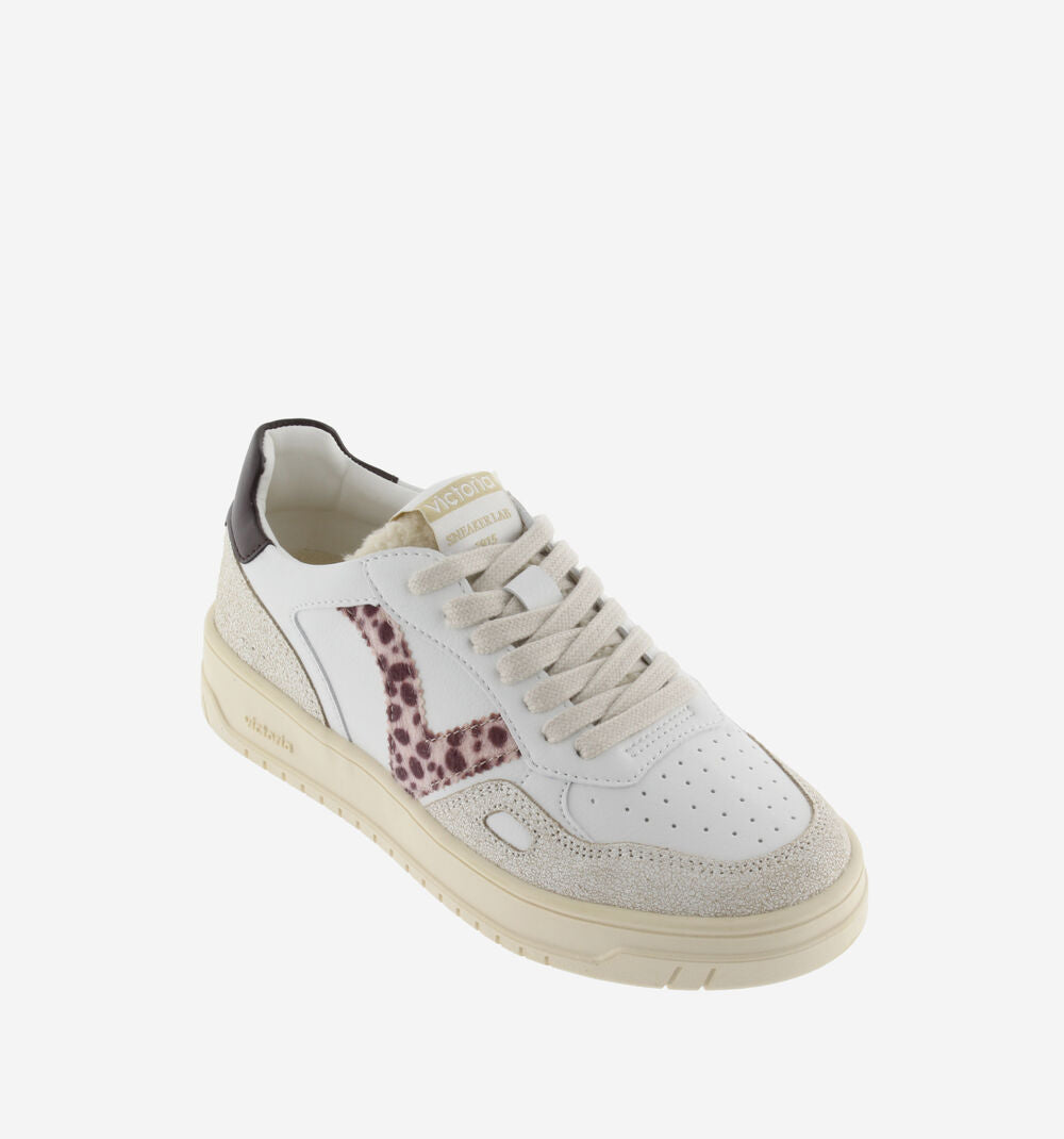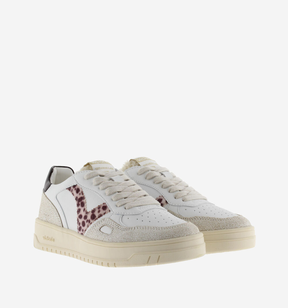 Sneakers sportive bianche da donna realizzate in materiale effetto pelle. V laterale con stampa animale e dettaglio colorato nell'inserto posteriore con il logo del marchio. Inserti in pelo sintetico sulla linguetta e dettaglio a finestra sul lato. Suola leggermente ambrata di 3,5 cm. Comprendono una soletta estraibile imbottita per un maggiore comfort.
